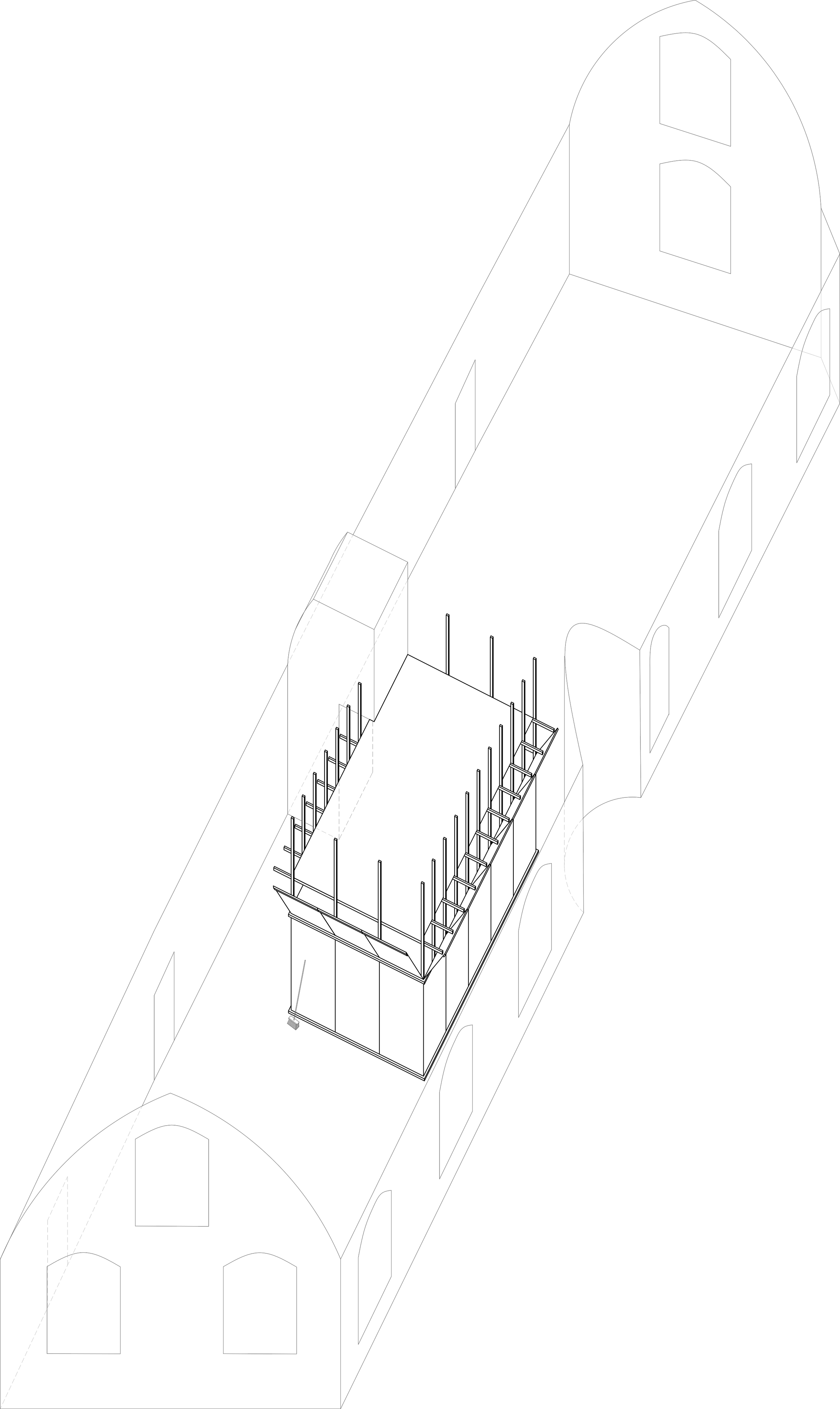De bovenkant van de doos kan van binnenuit geopend worden om daglicht naar binnen te halen of om de geluiden vanuit de houten constructie te laten resoneren met de ruimte van het kasteel.