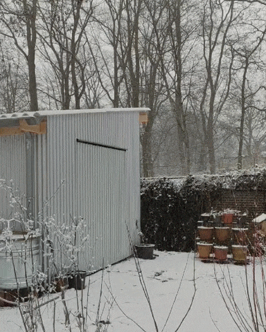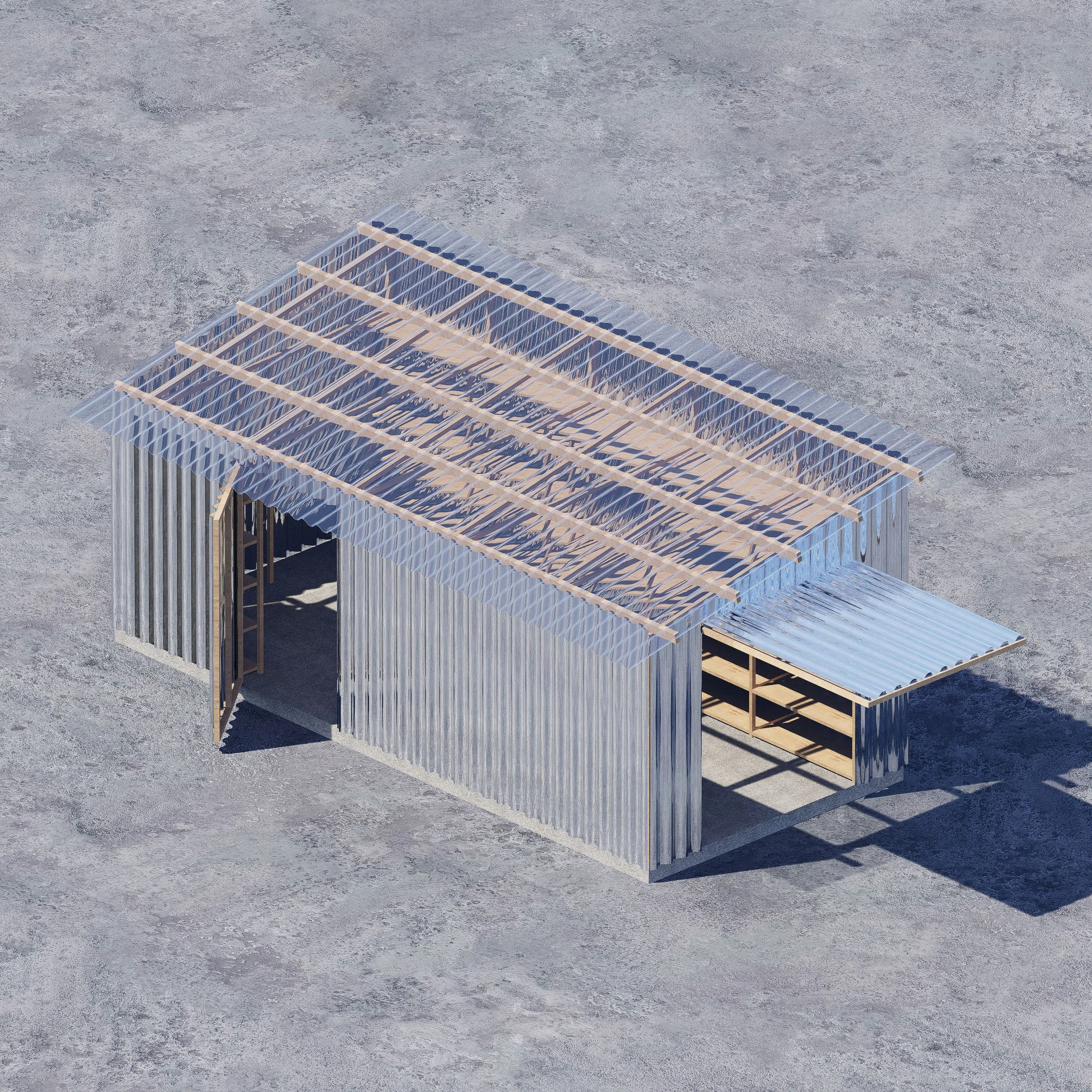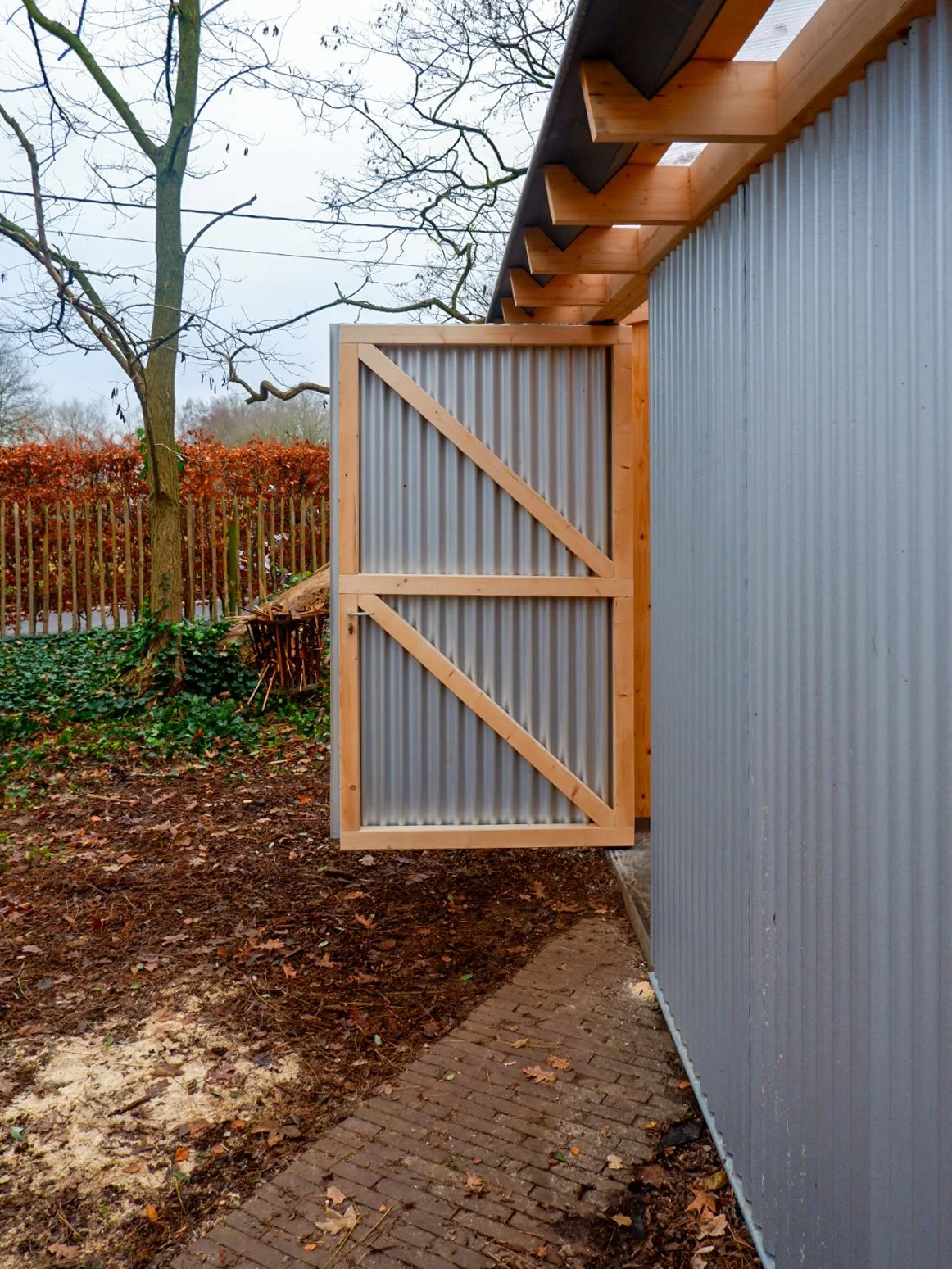 Een transparant golfplaten dak rust op een reeks houten opbergrekken en vormt zo een tuinhuis. De constructie wordt omsloten door een metalen gevel waarin twee opengaande delen zich elk in een andere richting openen.
